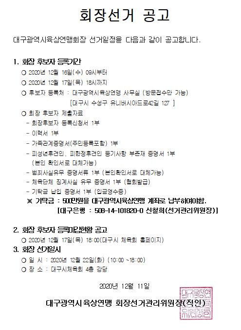 ❍ 2020년 12월 17일(목) 18:00(대구시 체육회 홈페이지)